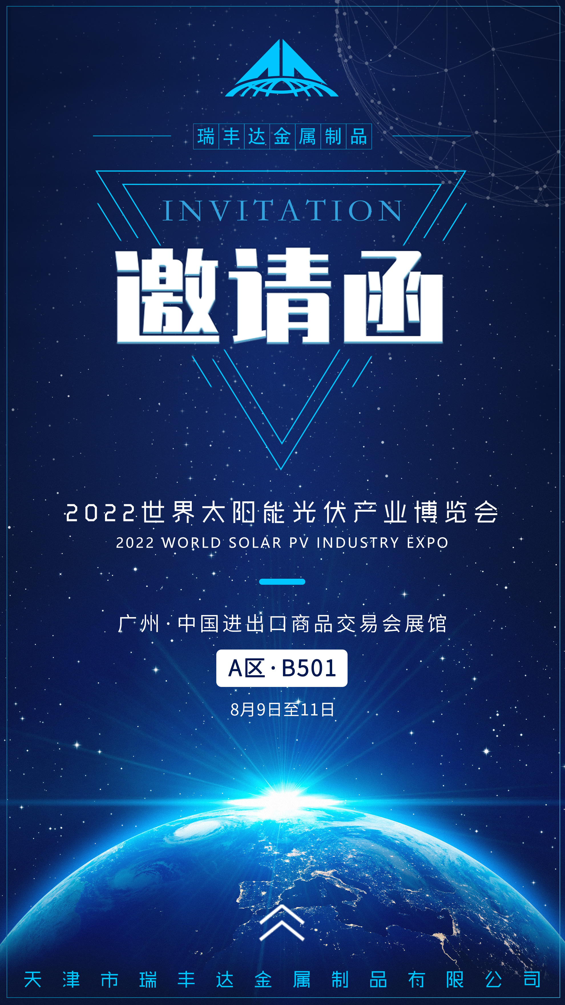 ????????天津市瑞豐達(dá)金屬制品有限公司致力于發(fā)展光伏發(fā)電新能源領(lǐng)域,為發(fā)展綠色社會(huì)、構(gòu)建人與自然生命共同體做出貢獻(xiàn)!8月9日-11日誠(chéng)摯邀請(qǐng)您蒞臨A區(qū)·B501展位,期待與您相約2022世界太陽(yáng)能光伏產(chǎn)業(yè)博覽會(huì),共同探討光伏科技新未來(lái)!??