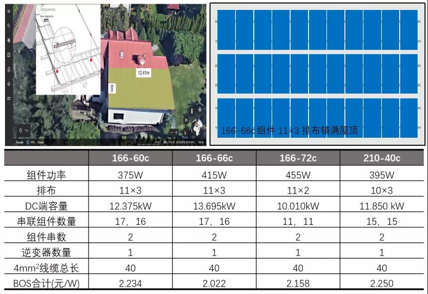 166的60c、66c組件可實(shí)現(xiàn)豎裝11×3排布,166-72c組件無(wú)法排滿3排,210-40c組件則只能排10列(10×3)。這種情況下,166-66c組件的總安裝容量最高,對(duì)應(yīng)的BOS成本也就最節(jié)省。