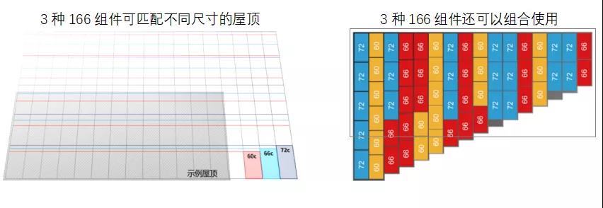 從鋪滿屋頂最大化安裝容量的角度,三種尺寸的166組件可以滿足不同應(yīng)用場(chǎng)景的需求;此外由于工作電流一致,三種166組件還可以組合使用,進(jìn)一步提高屋頂?shù)睦寐?,詳見下圖。