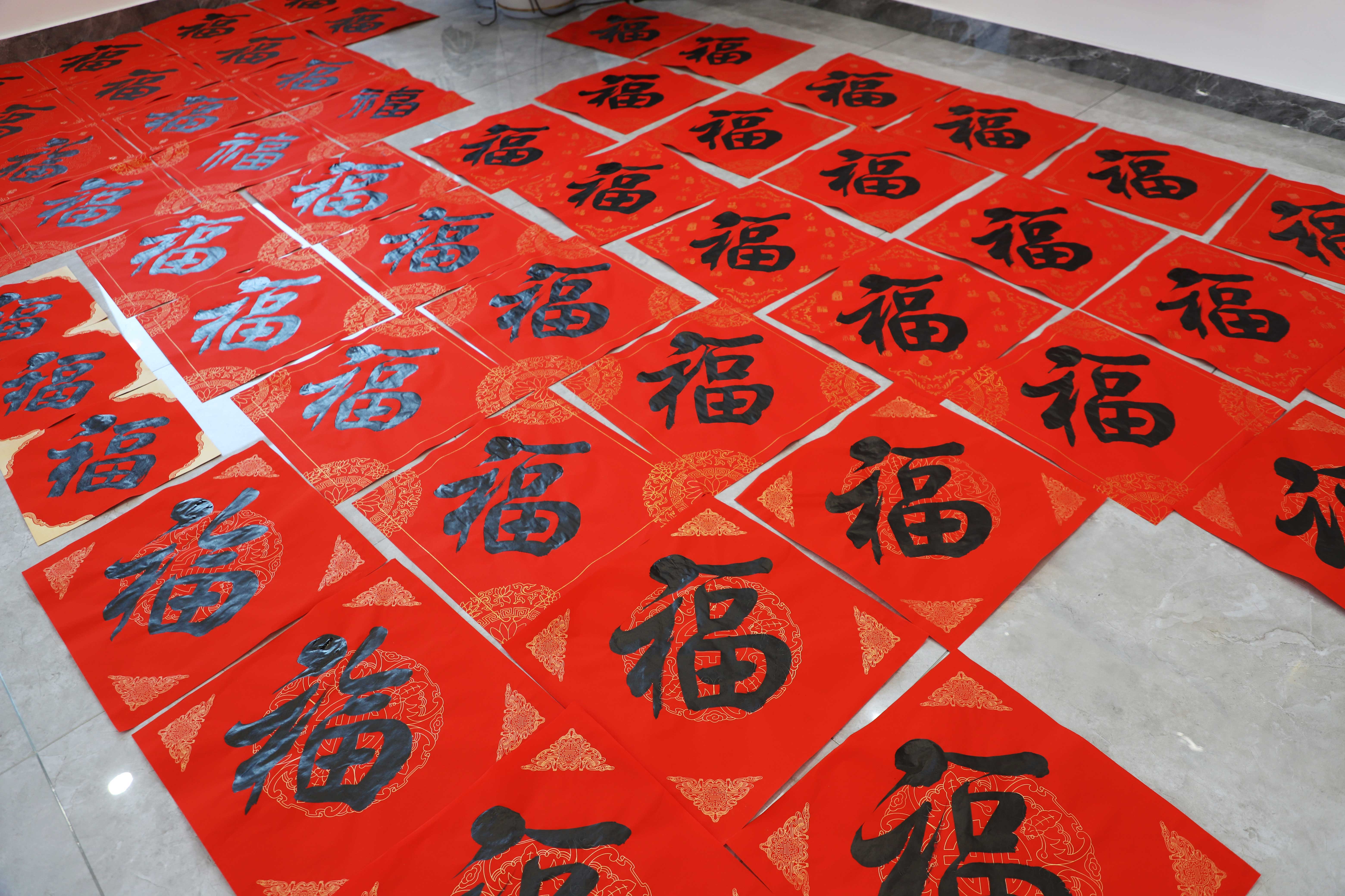 現(xiàn)場(chǎng)翰墨飄香,紅紙鋪展,毛筆在手中輕舞,墨汁在紙上暈染。