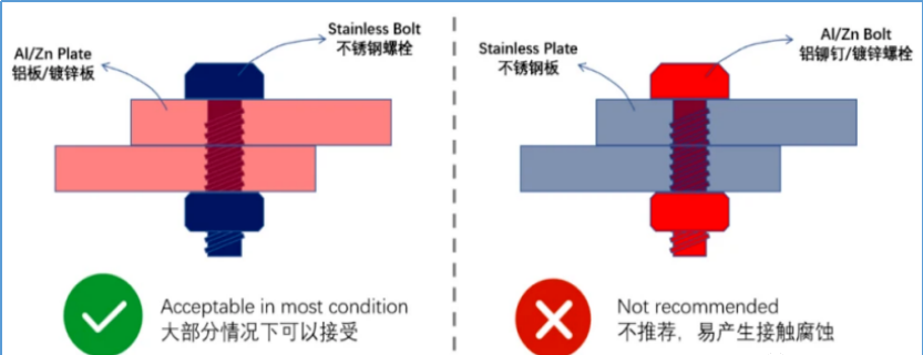 ????????光伏系統(tǒng)?-?使用鋁或鋅螺栓連接不銹鋼板時(shí)應(yīng)特別注意,防止不同金屬接觸引起電化學(xué)腐蝕。可以添加塑料墊圈以隔離兩種金屬并防止接觸腐蝕。