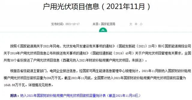 根據(jù)國家能源局統(tǒng)計(jì)數(shù)據(jù),截止到2021年11月30日,全國僅2021年納入國家財(cái)政補(bǔ)貼的戶用光伏就已經(jīng)達(dá)到了1648萬千瓦,遠(yuǎn)遠(yuǎn)超出今年的戶用光伏補(bǔ)貼指標(biāo)。如果算上最后一個(gè)月份的話,最少也在1800萬千瓦以上。今年一年的全國的安裝戶數(shù),預(yù)計(jì)在100萬戶以上。