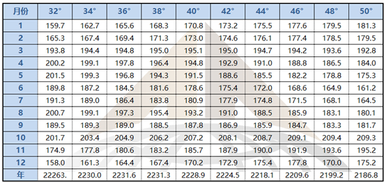 可以得出:當(dāng)傾斜角度處于36-38°之間時(shí)傾斜面上全年總輻射量最大。